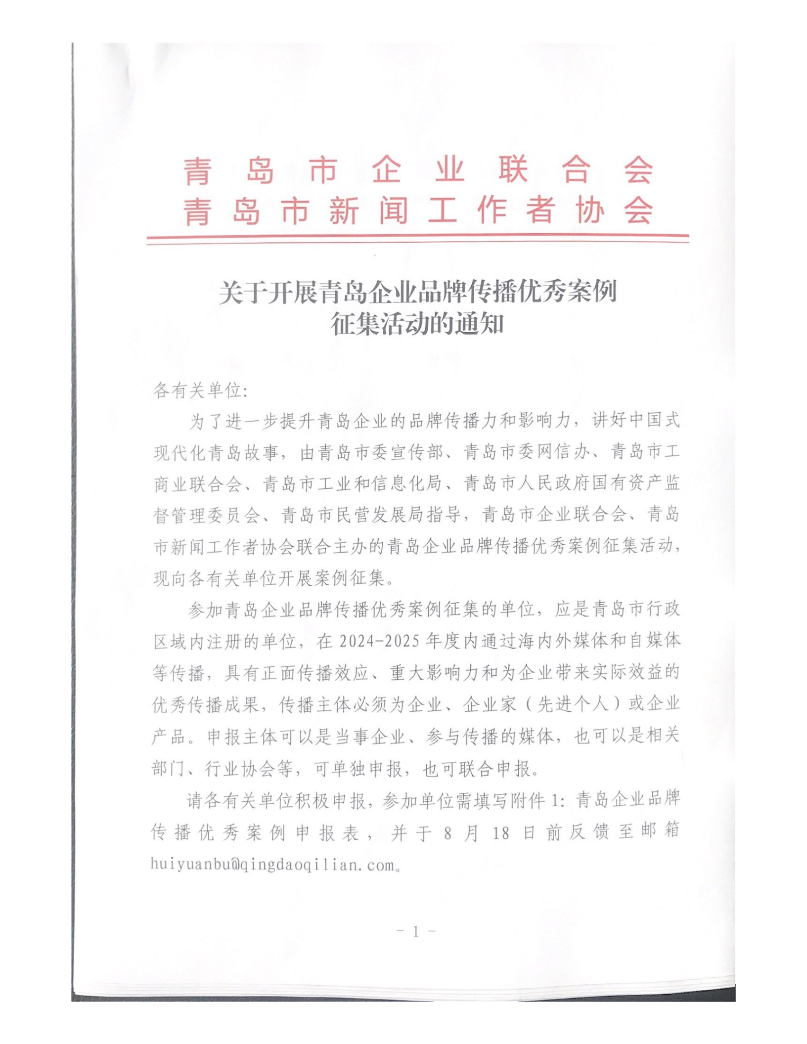 為深度挖掘我市“品牌之都”背后的精彩故事,廣泛傳播青島企業(yè)在品牌塑造與傳播領(lǐng)域的卓越實(shí)踐與創(chuàng)新智慧,助力青島品牌建設(shè)再攀高峰,青島市企業(yè)聯(lián)合會、青島市新聞工作者協(xié)會日前聯(lián)合向全市發(fā)出通知,啟動“青島企業(yè)品牌傳播優(yōu)秀案例”征集活動,誠邀全市相關(guān)單位踴躍參與,分享企業(yè)品牌傳播的精彩故事與豐碩成果!